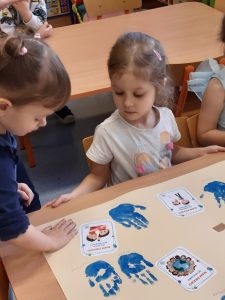 20 listopada to wyjątkowy dzień – dzień, w którym uwaga wszystkich kierowana jest na dzieci i ich prawa. Grupa 3-latków, solidaryzując się z dziećmi z całego świata, założyła dziś ubranka w kolorze niebieskim. Podczas zajęć dydaktycznych, najmłodsi przedszkolacy, dowiedzieli się, że mają liczne prawa m.in. prawo do zabawy, radości, spokojnej nauki i odpoczynku. Odciśnięta, niebieska rączka na grupowym plakacie, była potwierdzeniem znajomości tych praw. To był dzień z ważnym przesłaniem.