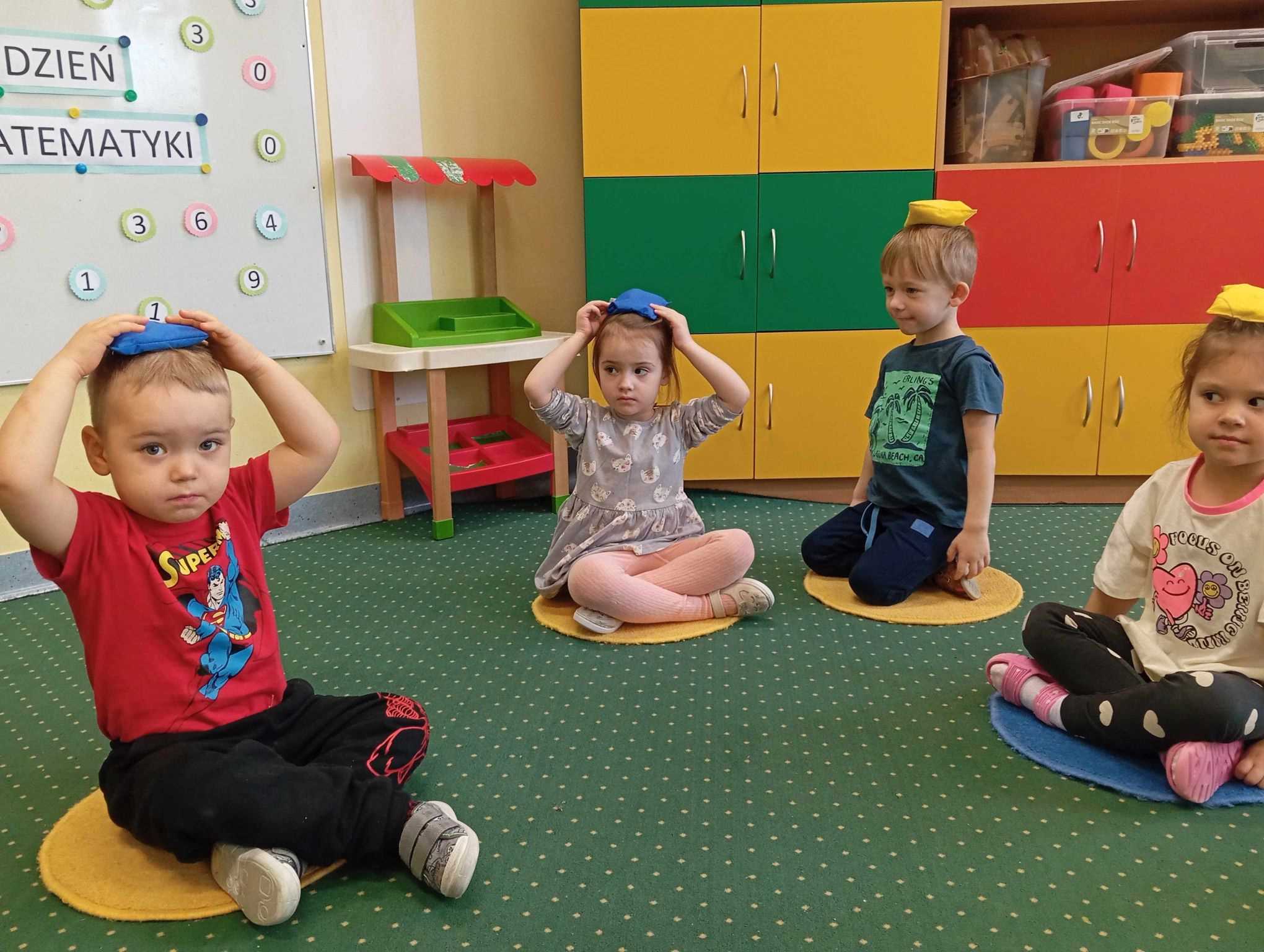 12.03.2025 roku 3-latki świętowały Dzień Matematyki. Od samego rana dzień wypełniony był aktywnościami matematycznymi – zaczęliśmy od utrwalania znajomości schematu własnego ciała śpiewając i pokazując do piosenki „Głowa, ramiona, kolana, pięty…”. Następnie dzieci kształtowały znajomość orientacji przestrzennej określając położenie woreczka gimnastycznego w przestrzeni wokół siebie. Dzieci ćwiczyły także umiejętność liczenia, klasyfikowania figur geometrycznych, a także porównywały długość pasków i układały z nich schody.