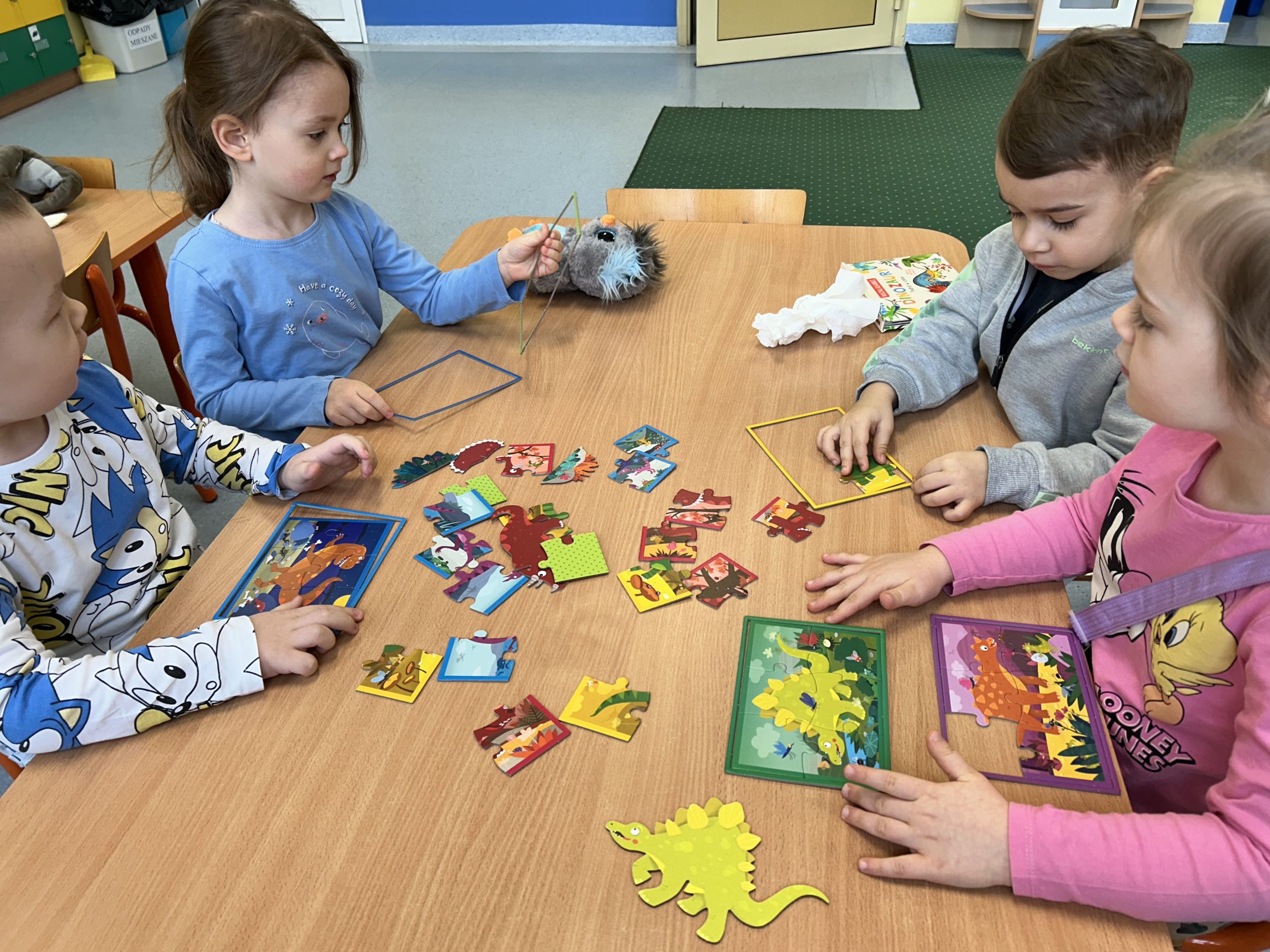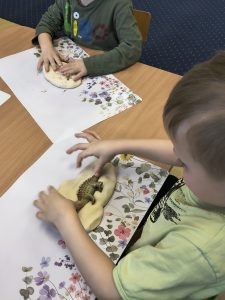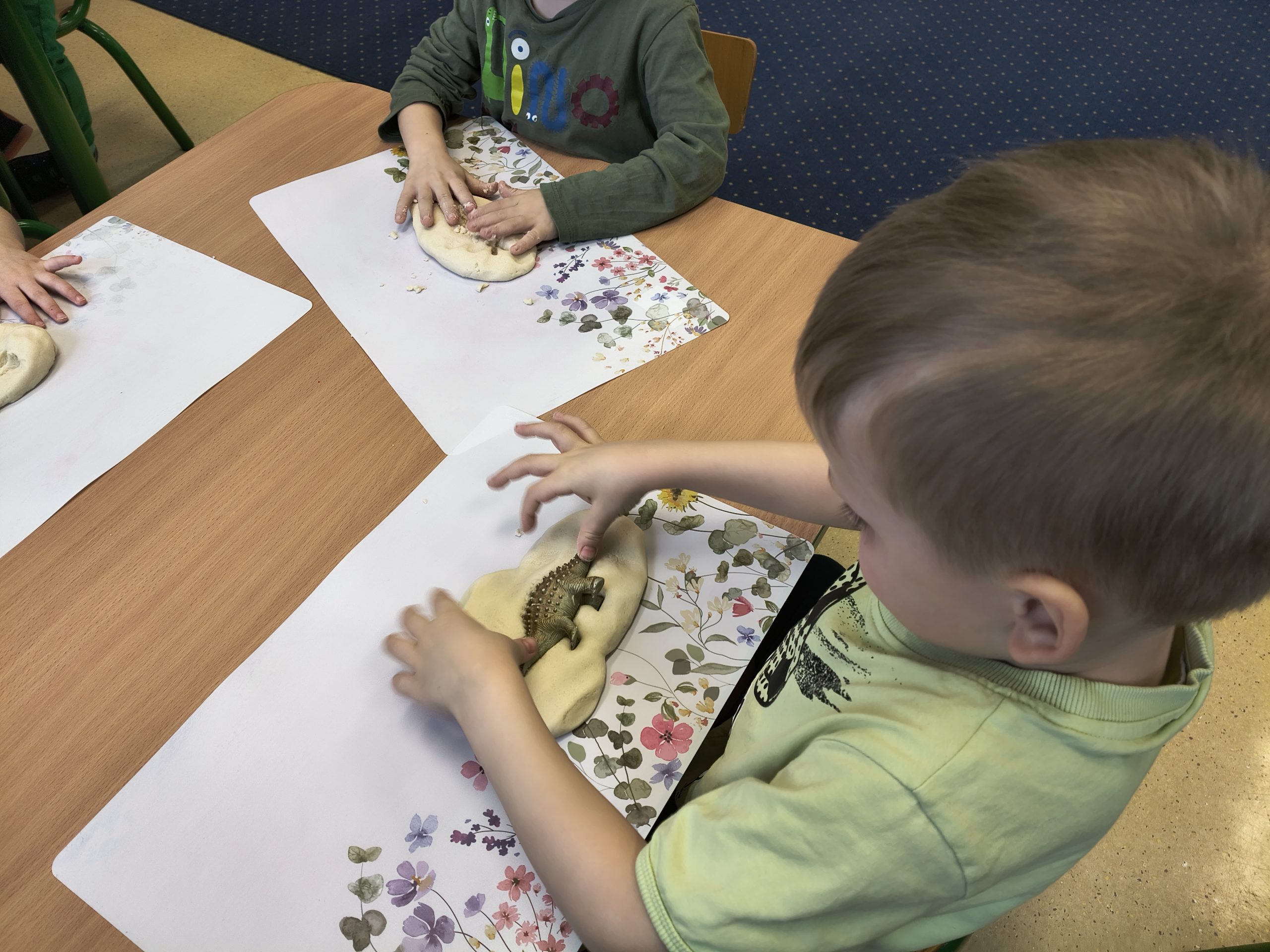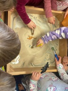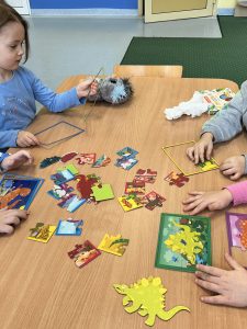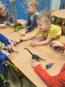 Przedszkolaki poznały nazwy i wygląd najpopularniejszych gatunków, takich jak potężny Tyranozaur czy łagodny Diplodok. Ruszyliśmy śladami dinozaurów, badając wykopaliska archeologiczne, tworząc sensoryczny park jurajski i tor przeszkód. Dzieci stworzyły pracę plastyczną, układały tematyczne puzzle i wnikliwe przeglądali książki z ulubionymi dinozaurami.